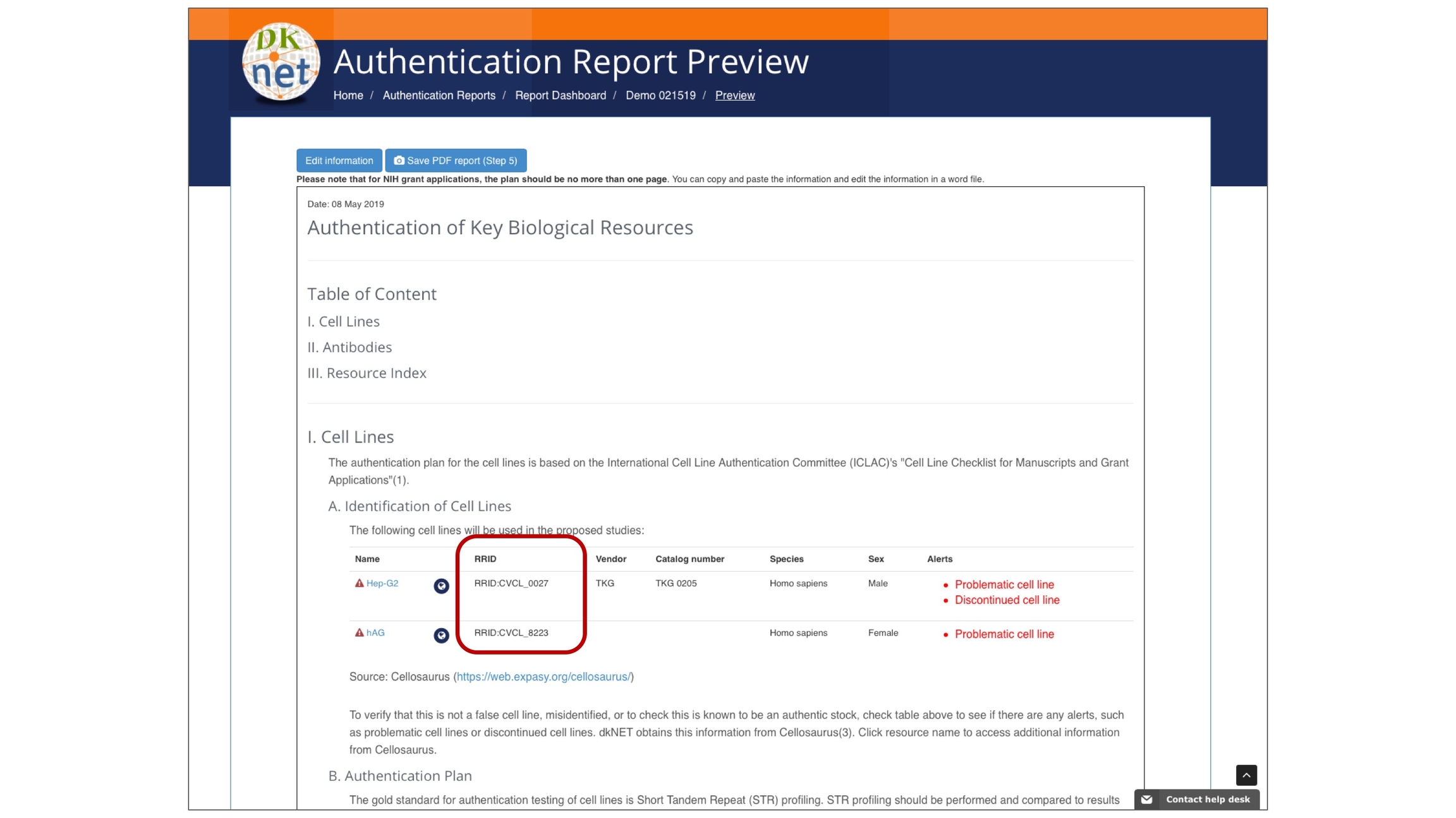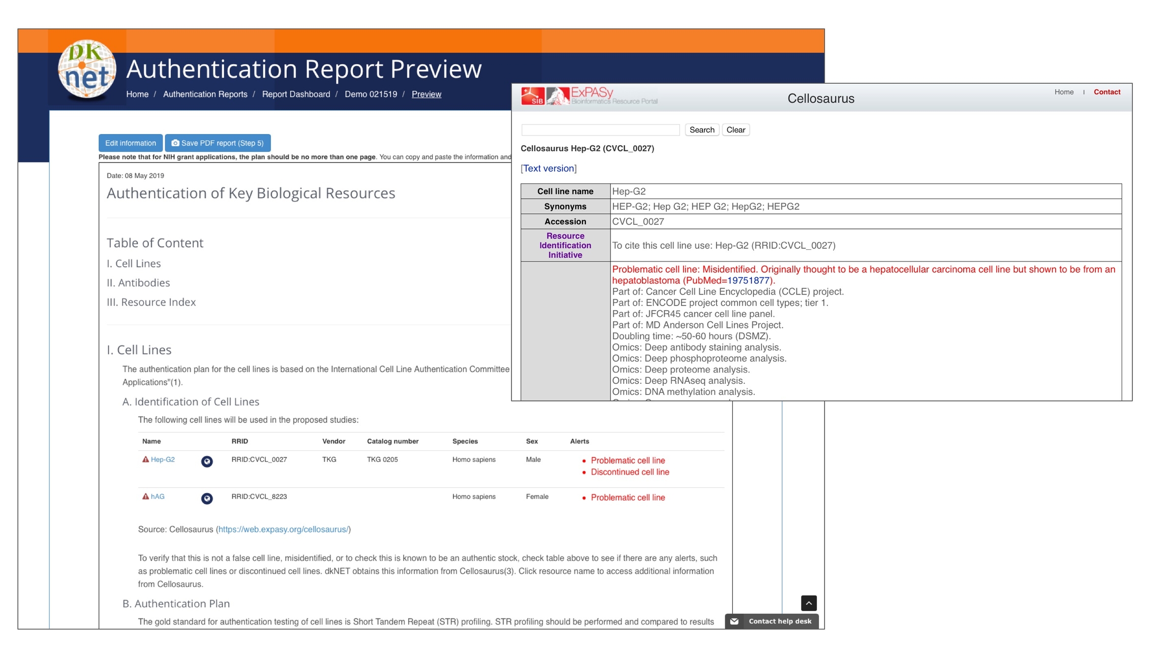 The dkNET team has implemented an automated tool in order to assist grant submitters in generating authentication reports (this tool is in its beta version). In order to use this tool, open a dkNET account now (it's free!). Through integrating with RRID, dkNET allows researchers to find resources in dkNET and to transfer those resources to the individual's named project. dkNET can then generate an authentication report with RRIDs and information used for identification and authentication plan of all the resources in the researcher's project. The researcher can then use this document for grant applications. Other uses of the report could include keeping the document as authentication material for lab or publication use. The Authentication Report dashboard can also alert researchers about known problems with a given resource.