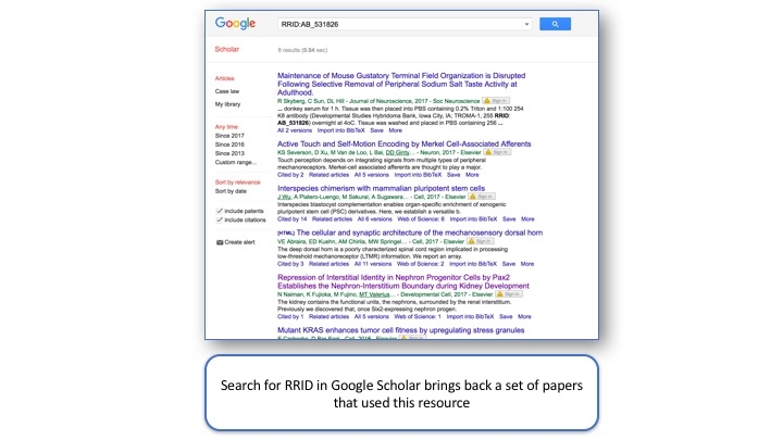 RRID is a unique and stable identifier for a single research resource. RRID indicates use of a research resource, not simply a mention. Again, using RRIDs in papers or grants allows researchers to identify the resources used in the studies, and it's a simple way to improve reproducibility and transparency. Use of RRIDs across journals is increasing. As of August, 2017, hundreds of journals request RRID citation to help fulfill NIH's guidelines for rigor and reproducibility. These journals include: Endocrine Society journals such as Journal of Endocrinology, American Journal of Physiology Gastrointestinal and Liver Physiology, Steroid Biochemistry and Molecular Biology, Journal of Hepatology, PNAS, The American Journal of Human Genetics, Cellular Signaling, Elsevier journals, BMC such as BMC Urology, Frontiers, Cell Press, eLife, and Wiley...etc.