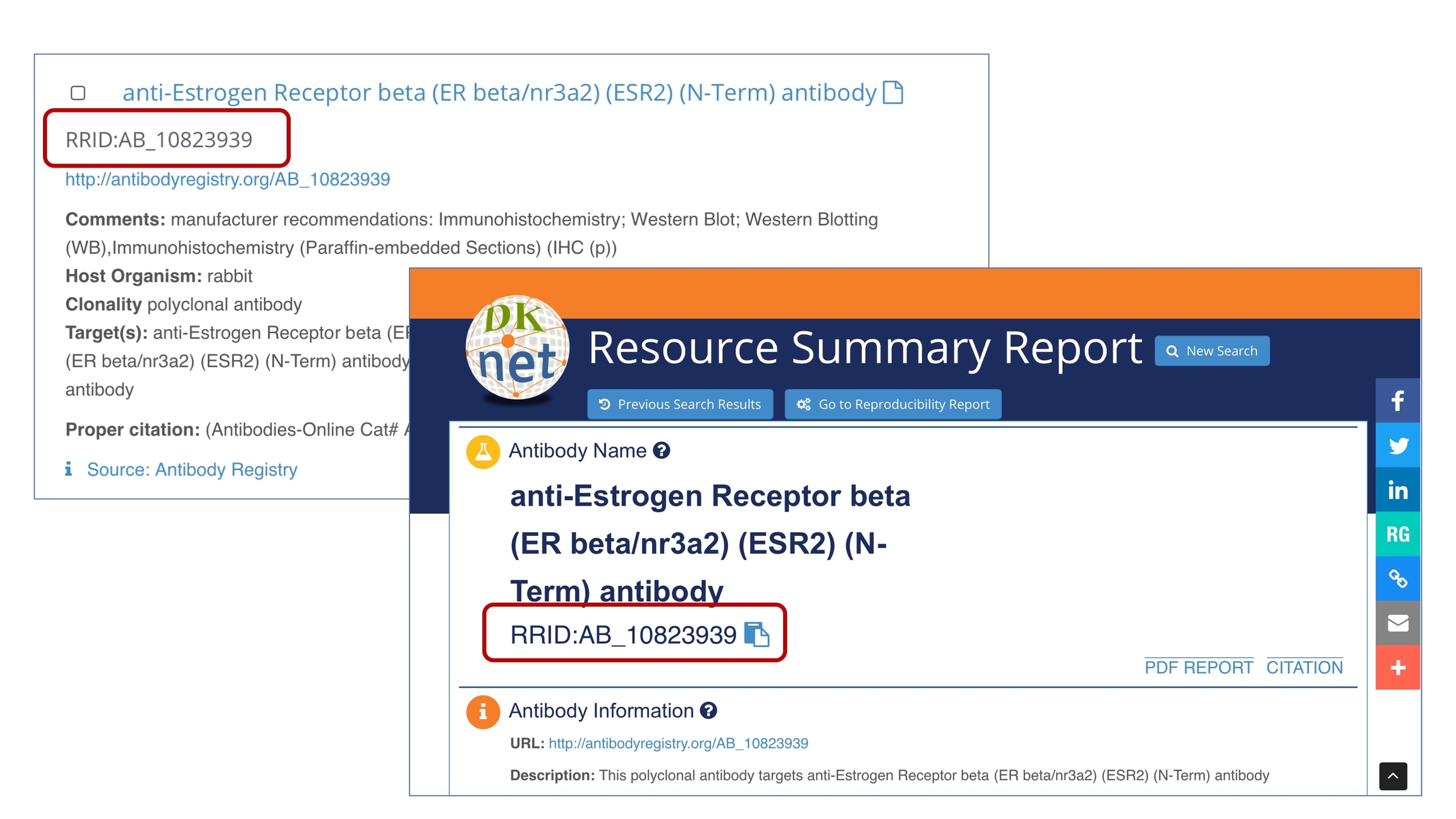 During the publication process, reported resource identifying information is typically lacking. Furthermore, no standard way of referencing a resource in a paper or grant has been implemented. This makes it a serious challenge for human or machine to identify the exact resources. Let's do a quick search using dkNET: by searching "estrogen receptor beta antibody", there are more than 100 antibodies in the results with the same antibody name. If only the antibody name is cited in a paper or grant, with no identifying tag, there is no viable way for a fellow researcher to know which antibody was specifically used in the mentioned context. This hinders their ability reproduce or further research the experiments cited in the paper or grant. Catalog numbers are sometimes mentioned with the name of an antibody in order to add some kind of specificity. However, these numbers are subject to numerous changes in the information they actually provide. Outside (often financially driven) forces such as the merging of companies, the restructuring of resource stock, or the closing of a certain manufacturer can greatly alter, or render completely inaccurate, the catalog number associated with an antibody at the time it was cited in a publication. The solution lies with RRID, a unique identifier for research resources. Providing uniformity in regards to citation and taking, RRIDs are being adopted by many players involved in reproducibility in the scientific community to solve the problem of keeping resources reproducible and identifiable.